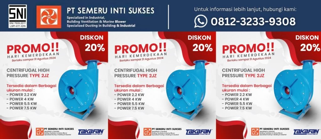 PT Semeru Inti Sukses, perusahaan spesialis dalam bidang industri, ventilasi bangunan, dan blower marine, memberikan penawaran menarik untuk merayakan Hari Kemerdekaan. Dapatkan diskon sebesar 20% untuk seluruh pembelian blower centrifugal high pressure tipe 2JZ.